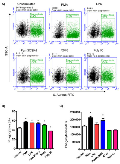 The impact of TLR priming on the phagocytosis activity of purified neutrophils was analyzed using flow cytometry. [24]. For this, heat-killed S. aureus (Pansorbin) was purchased from Calbiochem (Nottingham, UK) and labeled with fluoresceinisothiocyanate (FITC) according to the manufacturer’s protocol (fluoresceinisothiocyanate labeling kit, Sigma-Aldrich, St. Louis, MO, USA). Briefly, heat-killed S. aureus were washed twice with PBS (14,000× g and 4 °C for 5 min), resuspended in PBS, and incubated for 30 min with FITC (0.5 mg/mL) in 1 mL of PBS at RT in the dark. Subsequently, bacteria were washed 3 times in PBS (14.000× g for 5 min) to remove the unbound FITC molecules. Pelleted bacteria were resuspended in PBS and adjusted to 2 × 108 bacteria/mL and stored in aliquots at –80 °C. Control and stimulated neutrophils in 100 µL HBSS medium containing 1 × 106 cells were incubated with S. aureus-FITC in a ratio of 30 bacteria for each neutrophil for 30 min at 37 °C and 5% CO2. Finally, the unbound bacteria were removed by washing the plate in HBSS medium (centrifugation at 300× g for 3 min), and the cells were analyzed by flow cytometry after resuspension in 150 μL of HBSS medium.