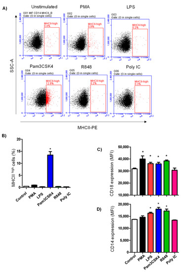 The stimulation-induced change in the abundance of the molecules CD14, MHCII, CD44, CD172a, CD11a, and CD18 was analyzed in camel neutrophils by flow cytometry. Only stimulation with Pam3CS4K induced a significant increase (p < 0.05) in the percentage of MHCIIhigh neutrophils (13.4 ± 0.3%) in comparison to control cells (0.4 ± 0.03% of total cells) (Figure 4A,B). With the exception of Poly IC, all TLR ligands enhanced the abundance of CD14 (Figure 4C) and CD18 (Figure 4D) on camel neutrophils (p < 0.05). Stimulation with PMA enhanced CD18 expression but did not affect the expression of CD18. There was no change in the expression density of CD44, CD11a, or CD172a on camel neutrophils after stimulation with PMA or the different TLR ligands (data not shown).