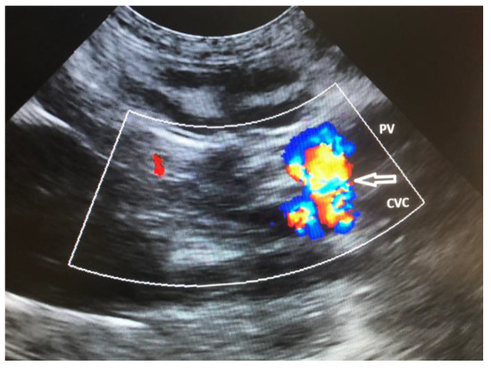 Sagittal plane ultrasound color flow Doppler image of the cranial abdomen in a dog showing the presence of an extrahepatic communication (arrow) of the portal vein (PV) with the caudal vena cava (CVC). There is turbulent blood flow within the shunt vessel indicated by the mosaic pattern of colors.