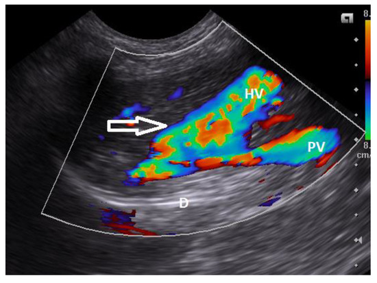 Ultrasonography (US) is the most commonly used technique for the detection of CPSS in dogs and cats due to its availability [56,76,126,127,128]. The US is a rapid, noninvasive technique that does not require general anesthesia. However, is an operator-dependent technique. Common findings are microhepatica, reduced hepatic and portal vein branch visibility, presence of an anomalous vessel or enlarged kidneys, and reduced portal vein/aorta ratio in dogs with ECPSS [30,56,60,76,128]. Turbulence in blood flow in the region of the CPSS insertion to the systemic venous system may also be identified. Diagnosis of CPSS requires imaging of the anomalous vessel from its origin to its termination [36,129]. Szatmári et al. (2004) described a protocol for systematic US evaluation of the portal system in dogs [129]. US drawback is the considerable variation in the reported accuracy for detection of CPSS (sensitivity 74–95%, specificity 67–100%), and therefore failure to locate a CPSS in US does not rule out the possibility of its presence [56,127,128,130]. ICPSS along with their morphology and hepatic division can be detected with US [Figure 4 and Figure 5 ], which sensitivity and specificity may reach 100% and they are more likely to be found compared to ECPSS due to their predictable location within the hepatic parenchyma [76,128,130].