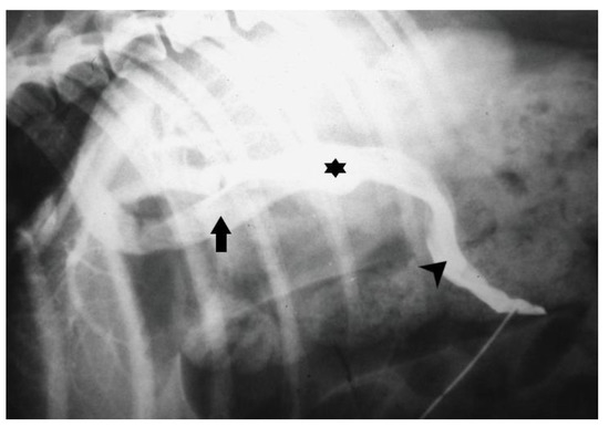 Lateral abdominal radiograph in a dog with a congenital extrahepatic portosystemic shunt. There is a cranial displacement of the stomach (st) and transverse colon (c) suggesting the presence of microhepatica.