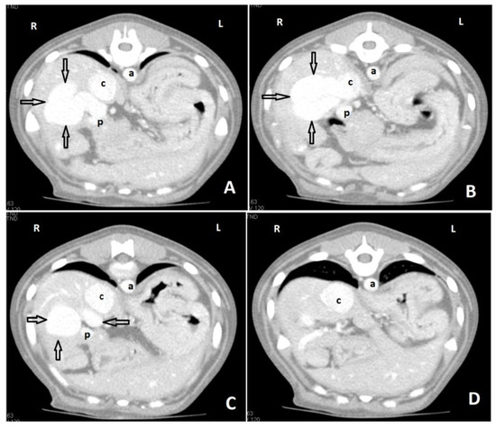 Axial portal phase angiographic images of a young dog with an intrahepatic portocaval shunt. Images are ordered from caudal to cranial (A–D). There is a large, tortuous shunt vessel (arrows) arising from the right side of the portal vein (p), and through the right liver lobes to enter the caudal vena cava (c). There is dilation of the caudal vena cava after the insertion of the shunt vessel. (a: aorta; R: right side; L: left side).