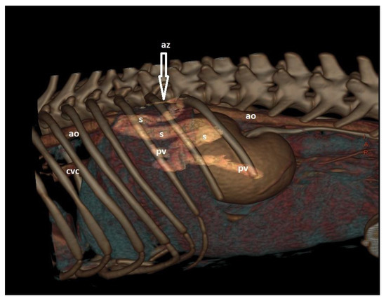 A 3D rendering image from the lateral aspect of a dog with a porto azygos shunt. There is a large, anomalous vessel (s) arising from the portal vein and after a tortous course travels dorsally and enters into the azygos vein (az). (ao: aorta; cvc: caudal vena cava; pv: portal vein).