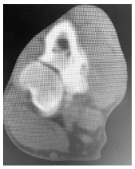 CT image of case 1 treated with MCDE. Note the small and misshapen medial coronoid process with decreased density and separated from the adjacent bone.