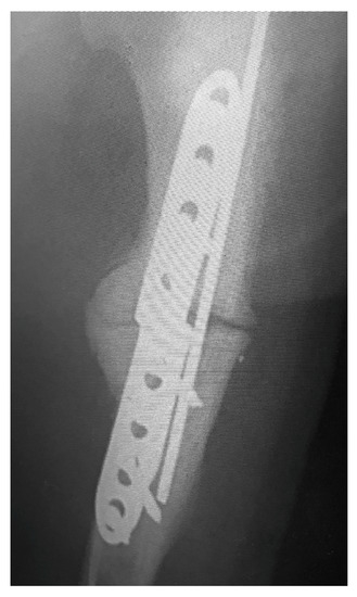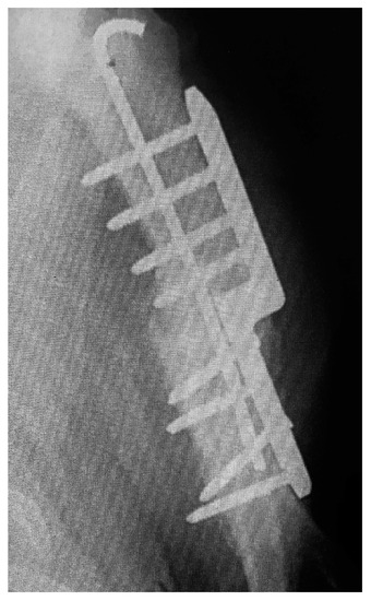 The intramedullary plate-rod system is primarily indicated for complex fractures [17,18,19,20]. It has been shown that the intramedullary pin reduces the forces acting on the bone plate, which prevents screw loosening by increasing the fatigue life of the plate and facilitates the alignment of the bone shaft with the pin ideally being 30–40% of the bone diameter [6,19,21]. Bone plates have been used to bridge a simulated fracture gap in canine femurs, and the combination of a bone plate and an intramedullary pin have proved to be superior in reducing plate stress compared with the plate alone [6]. It was shown that a plate-rod combination represented a biomechanically superior fixation technique, compared with an interlocking nail, for the repair of comminuted tibial diaphyseal fractures [18]. The addition of an intramedullary pin reduces the stress applied to the plate, and as much as a 10-fold extension of the fatigue life of the bone plate can be achieved [6]. The pin can also assist in spatial aliniation of the limb and main fracture bones [9]. Sometimes unicortical placement of many of the plate screws is necessary because of the bone stock available [18]. Thus, plate-rod constructs can successfully be used for the repair of diaphyseal fractures of a wide range of severity in dogs and cats [8]. In our cases, the bone stock was available for the bicortical placement of all screws.