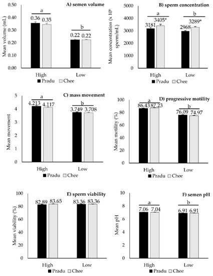 Comparison between Pradu Hang Dam and Chee roosters with high and low ejaculate semen (mean ± SE) on (A) semen volume, (B) sperm concentration, (C) mass movement, (D) progressive motility, (E) sperm viability, and (F) semen pH. Means between the high and low groups with superscript letters a and b indicate significant differences (p < 0.05). Means between chicken breeds in each high and low group with the superscript symbol * indicate significant differences (p < 0.05).