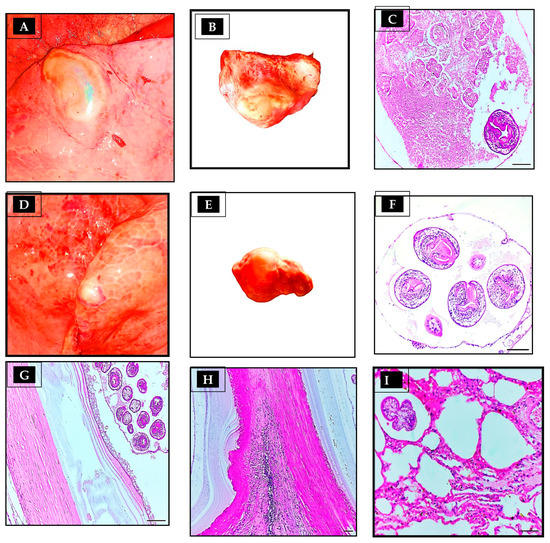 Morphological appearance of hydatid cyst in the lung of camels. (A) Camel lung with intact, (A,B) medium size, and (D,E) small size tumor-like fluid-filled hydatid cysts, enveloped by a fibrous capsule. (C,F) Cross-section of an hydatid cyst, stained with H&E displaying brood capsule and scolex holding multiple hooklets (thick arrow); (G) Lung section viewing fibrous tissue capsule infiltrated with inflammatory cells, parasitic membranes, and scolices. (H) Camel lung section of camel origin hydatid cyst showing the laminated membrane, the fibrous tissue capsule infiltrated with inflammatory cells. (I) Lung section of camel origin showing existence of parasitic sections in the lung tissue.