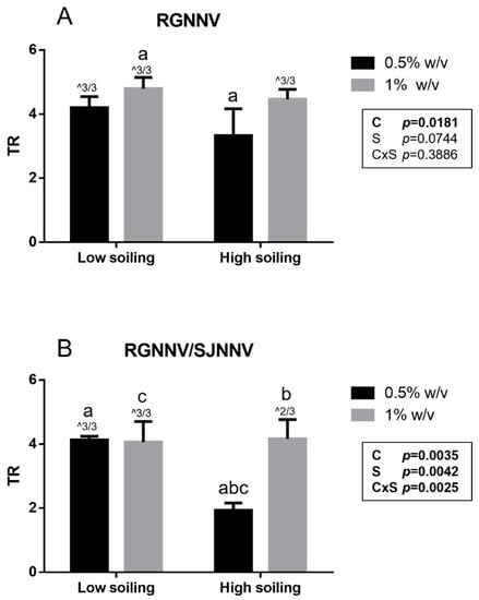 Suspension test results obtained for the RGNNV strain (A) and the reassortant RGNNV/SJNNV strain (B). TR: titer reduction; C: disinfectant concentration; S: soiling level. The same superscript letters indicate significant differences among titer reduction values (p ≤ 0.05). ^ indicates the number of test repeats where no CPE was detected.