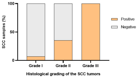 Overall, 48.9% (22 cases) were female and 42.2% (19 cases) were male, having missing data from four animals. The ages ranged from 1 to 17 years (mean = 8.9 ± 3.6 years) and their breed details are given in Table 1. Most of the SCC samples were from the oral cavity (50%), and the others were from several parts of the corporis integument (50%) [39]. The tumor sizes were larger than 2 cm in 66.7% of the cases.