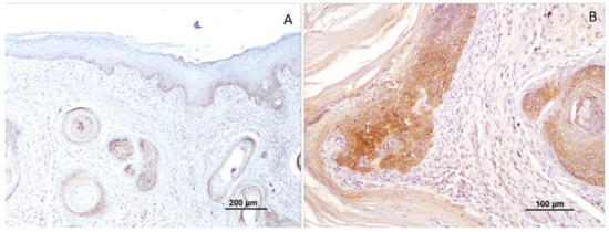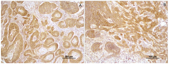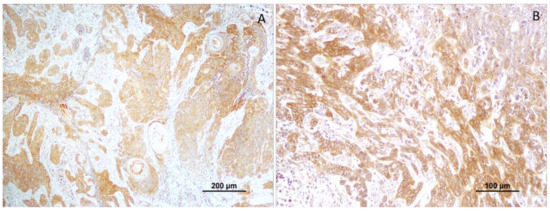 CTEN was first described to have restricted expression in the human prostate and placenta [1]; however, after almost 20 years of studying this protein and its gene, it has been frequently reported to be upregulated in multiple human cancers, suggesting its role as an oncogene. In animals, in vitro studies using Madin–Darby canine kidney (MDCK) cell lines suggested that CTEN is involved in multiple cellular mechanisms, including invasion of the extracellular matrix, through CTEN–keratin network interaction, since keratins are key factors in cell migration [24,25]. However, there is no evidence regarding CTEN expression in canine tumors; therefore, our main aim was to evaluate CTEN immunoexpression in canine SCC.