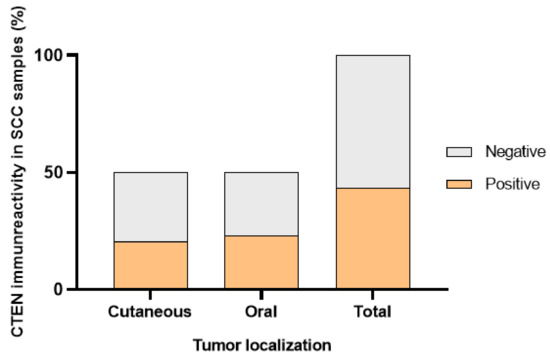 A possible association between CTEN expression and the localization of the tumors (cutaneous/oral) was also evaluated. However, the differences between CTEN expression in cutaneous and oral tumors were not statistically significant (p = 1); Figure 5.