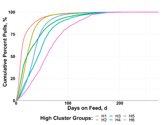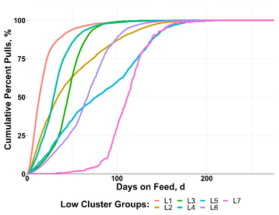 Model-estimated DOF to 50% cumulative BRD first treatment drastically differed between HIGH and LOW clusters and notably within the respective clusters. Four cluster groups stand out in this analysis: H6, L5, L6, and L7, which were estimated to hit 50% of their first BRD treatment by day 59.8, 61.2, 60.6 and 109.8, respectively on feed. These clusters would be considered much later than typical for the industry. The authors of [27] reported that 74% of BRD cases occurred within the first 42 days on feed, which many of the cluster groups achieved [27]. However, a few clustering groups were outside 42 days on feed, which could bear relation with what the industry is describing as mid- to late-day BRD [8,28]. The LOW clusters had overall lower morbidity, which means that even regardless of timing, fewer cattle were treated. Thus, when comparing the percentages of cattle treated, one must consider the total number of cattle treated (denominator) relative to the timing of treatments.