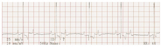 The Holter ECG registration showed sinus arrhythmia as basic rhythm and longer periods of severe bradycardia due to intermittent second- and third-degree AV-block (Figure 8).