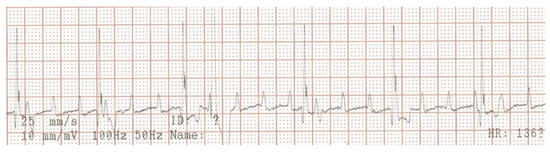 Three blood samples for bacterial cultures were collected with one-hour intervals from three different peripheral veins after surgical preparation of the venipuncture sites (i.e., clipping the hair and disinfection of the skin with alcohol), to investigate the presence of a possible sepsis. The blood samples were submitted to the microbiology laboratory of the authors’ institution. Thereafter, parenteral antibiotic therapy with amoxicillin with clavulanic acid (12.5 mg/kg IV q8h) and enrofloxacin (5 mg/kg SC q24h) was started. The next day reddish brown discharge appeared from the cervical wound, which was sampled and submitted to bacterial culture. The dog’s general condition started to improve slowly, and the rectal temperature normalized. Electrocardiogram showed a third-degree AV-block and a good functioning pacemaker with only paced QRS-complexes and 100% capture (Figure 5).