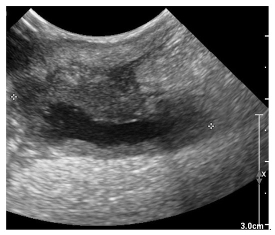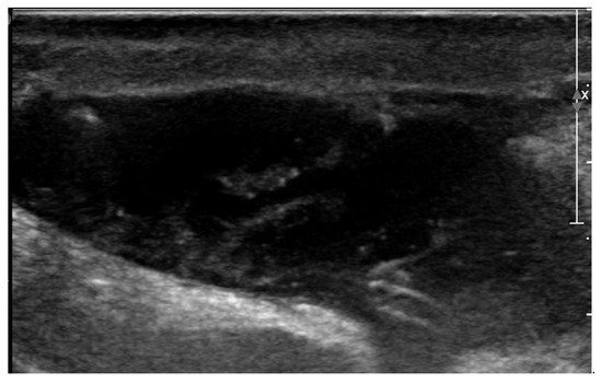 Three weeks after cessation of the oral antibiotic therapy, the dog became lethargic again and the owner noticed discharge from the previously healed cervical wound. The dog was presented again to the authors’ teaching hospital. Physical examination revealed a lethargic dog with a rectal temperature of 39.5 °C, and a warm and red lump of about 5 × 5 cm at the region of the previous surgical wound over the right jugular vein. In the skin overlying the lump, an opening of about 3 mm was visible, where purulent discharge was noticed. The dog was hospitalized again. Ultrasonographic examination of the lump was performed, which again identified a subcutaneous fluid pocket, but this time surrounded by a thick wall (Figure 7).