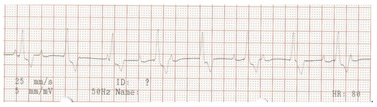 Surface electrocardiogram at initial presentation. Lead aVF shows a second-degree atrio-ventricular block, where every other P-wave is not conducted to the ventricles.