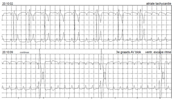Third-degree AV-block in dogs is typically a constantly present arrhythmia. However, in the present case, this was initially intermittent, and also paroxysmal third-degree AV-block caused the syncopal episodes.