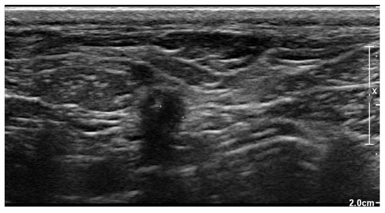 The recheck examination 2 weeks later revealed no abnormalities with inspection and palpation of the region where previously the wound was located over the right jugular vein. Ultrasonography showed no subcutaneous fluid accumulation around the pacing lead, but there was a small region of hypoechoic tissue visible (Figure 9).