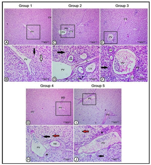 A histopathological analysis of the hepatic architecture in the experimental groups (A,B): the livers in the first group (Con) showed normal hepatic architecture. The central vein (CV) was in the center of each hepatic lobule and the hepatocytes (black arrow) were arranged in plates that radiate longitudinally outward from the central vein that was separated by a hepatic sinusoid (white arrow). The portal triad contained a branch of the portal vein (PV). The livers of the second and third groups (C–F, respectively) revealed a better organization of the hepatic cells (black arrows) and hepatic sinusoid (S) in between. The portal triad is composed of a large-sized branch of the portal vein (PV), with numerous branches of the hepatic artery (HA), and bile ducts (BD), in addition to lymphatic tissues (LV). The livers in the fourth and fifth groups (G–J, respectively) illustrate disorganized and degenerated hepatocytes (black arrows) around the central vein (CV), numerous variable-sized hepatic sinusoids (red arrows), excessive connective tissue, lymphocytic infiltration (black asterisks), fewer branches of the hepatic artery (HA), and bile duct (BD).