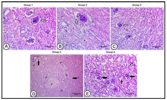 A histopathological analysis of the renal cortex in the experimental groups (A): Renal cortex of the control group showing glomeruli of reptilian-type nephrons (RG) and glomeruli of mammalian nephrons (MG), and proximal (P) and distal (D) convoluted tubules. The glomerulus was surrounded by thin glomerular basement membranes (black arrow). The renal cortex of the second (B) and third (C) groups revealed large-sized proximal (P) and distal (D) convoluted tubules. The glomeruli (G) increased in size in the second group; however, their size was slightly reduced in the third group. The glomeruli were surrounded by thin glomerular basement membranes. The renal cortex of the fourth group (D) shows small-sized glomeruli (black arrows) and a concentric arrangement of distal convoluted tubules (D) around the intralobular vein (V). The renal cortex of the fifth group (E), illustrating small-sized glomeruli, surrounded by irregularly disrupted basement membranes (black arrows), and large interstitial spaces (black asterisk) between small-sized proximal (P) and distal (D) convoluted tubules. Note the presence of atrophied tubules (white arrows) and few lymphocytic infiltrations (red arrows).