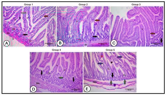 A histopathological analysis of the small intestines in the experimental groups (A): Duodenum of the control group showing mucosa (M), submucosa (SM), muscularis (Ms), and serosa (S) tunics. The lamina epithelialis consisted of simple columnar epithelial cells (white arrows) and goblet cells scattered among them (red arrows). The intestinal villi consisted of connective tissue core (C) and exhibited intestinal glands (crypts of Lieberkühn, CL). The submucosa revealed submucosal glands (black arrows). (B,C): Intestinal wall of the second and third groups, respectively, revealing longer and wider intestinal villi (V), numerous goblet cells (red arrows), deeper and larger crypts of Lieberkühn (CL), and large-sized submucosal glands in the second group, with the beginning of their size reduction in the third group (black arrows). (D): Duodenal wall of the fourth group showing reduced intestinal villi (V) packed with a less connective tissue core (C). The intestinal glands (CL) were smaller and the submucosa glands were numerous and small in their size (black arrows). (E): Duodenal wall of the fifth group illustrating short intestinal villi with irregular lamina epithelialis (blue arrows), degenerated areas (black asterisk), lymphocytic infiltration (red asterisk), poor connective tissue cores (C), and smallest and shortest intestinal glands (CL). Note the presence of numerous small-sized submucosal glands (black arrows), together with some atrophied ones (green arrows), and a narrow muscular tunic (Ms).
