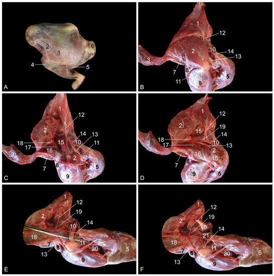 Dorsolateral views of the left hip region. (A) Superficial layer; (B) second layer after the m. gluteus superficialis and the m. tensor fasciae latae were retracted, and the m. vastus lateralis was detached from the m. biceps femoris; (C) third layer after the m. gluteus medius was retracted; (D) fourth layer after the m. piriformis was retracted; (E) fifth layer after removal of the stump of the m. gluteus profundus, and lateral retraction of the n. ischiadicus; (F) deepest layer after the m. obturatorius internus was retracted. 1: M. gluteus superficialis; 2: m. gluteus medius; 3: m. tensor fasciae latae; 4: fascia lata; 5: m. biceps femoris; 6: callositas ischii; 7: m. iliopsoas; 8: m. rectus femoris; 9: m. vastus lateralis; 10: m. obturatorius internus; 11: m. quadratus femoris; 12: n. gluteus caudalis; 13: n. ischiadicus; 14: n. cutaneus femoris caudalis; 15: m. piriformis; 16: m. gluteus profundus; 17: n. gluteus cranialis; 18: corpus ossis ilii; 19: a. pudenda interna + n. pudendus; 20: m. vastus intermedius; 21: mm. gemelli.