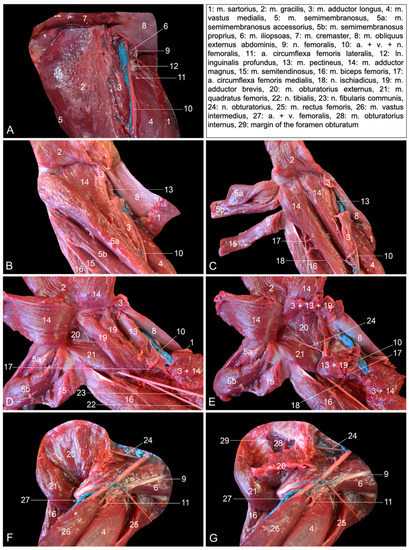 Ventromedial views of the left hip region. (A) Superficial layer, in which the m. sartorius is slightly retracted cranially; (B) second layer after the m. sartorius and the m. gracilis have been retracted; (C) third layer after the m. semimembranosus accessorius, the m. semimembranosus proprius and the m. semitendinosus have been retracted; (D) fourth layer after the m. adductor longus and the m. adductor magnus have been retracted; (E) fifth layer after the m. pectineus and the m. adductor brevis have been retracted; (F) sixth layer after the resection of the muscle stumps of the previously retracted muscles; (G) deepest layer after the m. obturatorius externus has been retracted.