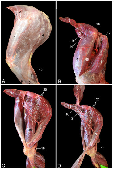 Craniolateral views of the left upper hindlimb. (A) Superficial layer; (B) second layer after the retraction of the m. tensor fasciae latae and the separation of the m. vastus lateralis from the m. biceps femoris; (C) third layer after the m. tensor fasciae latae was removed and the m. vastus lateralis was maximally withdrawn from the m. biceps femoris; (D) deepest layer after the m. vastus lateralis was distally retracted. 1: M. gluteus superficialis; 2: m. gluteus medius; 3: m. tensor fasciae latae; 4: fascia lata; 5: m. biceps femoris; 6: m. semitendinosus; 7: m. semimembranosus; 8: callositas ischii; 9: m. tibialis cranialis; 10: m. fibularis longus; 11: m. gastrocnemius caput laterale; 12: v. saphena lateralis; 13: m. iliopsoas; 14: m. rectus femoris; 15: m. vastus lateralis; 16: n. femoralis; 17: n. fibularis communis; 18: n. tibialis; 19: m. vastus intermedius; 20: muscular branches (rami musculares) of the a. glutea caudalis; 21: a. + v. femoralis.