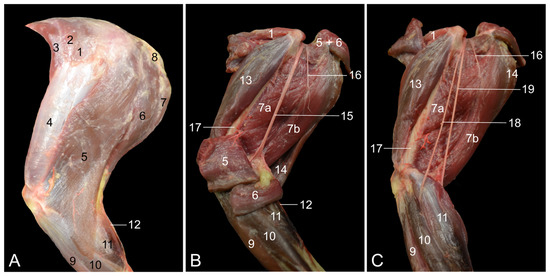 Caudolateral views of the left upper hindlimb. (A) Superficial layer; (B) second layer after the m. biceps femoris and the m. semitendinosus were transected and their stumps were retracted; (C) deepest layer after the stumps of the m. biceps femoris and m. semitendinosus were removed, and the n. fibularis communis was separated from the n. tibialis. 1: M. gluteus superficialis; 2: m. gluteus medius; 3: m. tensor fasciae latae; 4: fascia lata; 5: m. biceps femoris; 6: m. semitendinosus; 7: m. semimembranosus; 7a: m. semimembranosus accessorius; 7b: m. semimembranosus proprius; 8: callositas ischii; 9: m. tibialis cranialis; 10: m. fibularis longus; 11: m. gastrocnemius caput laterale; 12: v. saphena lateralis; 13: m. vastus lateralis; 14: m. gracilis; 15: n. ischiadicus; 16: muscular branches (rami musculares) of the n. ischiadicus; 17: femur; 18: n. fibularis communis; 19: n. tibialis.