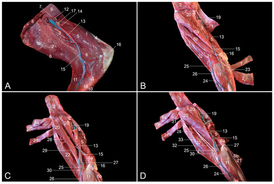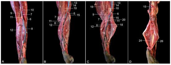 The most superficial muscles that become visible after skinning the medial side of the hip region are the m. sartorius and the m. gracilis (Figure 2A). Together, they delineate Scarpa’s triangle (trigonum femorale). The m. gracilis is a broad muscle that starts from the pelvic symphysis and attaches to the craniomedial aspect of the proximal third of the tibia. The m. sartorius is a long, slender muscle that arises from the cranioventral spine of the ilium. It inserts into the medial side of the proximal third of the tibia. When this muscle is slightly retracted in the cranial direction, a portion of the m. vastus medialis, the m. iliopsoas, the m. adductor longus and the m. semimembranosus can be identified from cranial to caudal. The m. vastus medialis arises from the lesser trochanter of the femur and inserts into the base of the patella. The origin of the m. adductor longus is the pelvic symphysis. It is located lateral (deep) to the gracilis muscle and inserts medially, halfway along the femur. The semimembranosus muscle consists of the smaller and more lateral semimembranosus proprius muscle and the larger and more medial semimembranosus accessorius muscle. Both originate caudally on the sciatic tuberosity. The semimembranosus proprius muscle is inserted medially on the tibial tuberosity, while the accessory semimembranosus muscle is broadly inserted more proximally, at the level of the medial femoral condyle. These muscles can be well distinguished in Figure 2B. The a. femoralis runs within the femoral trigonum together with the v. femoralis. The initial trajectory of the n. femoralis is cranial to the homonymous artery and vein and superficial (medial) to the m. iliopsoas. It joins the femoral artery and vein a few centimeters distal to the base of the femoral trigonum. The ln. inguinalis superficialis is located on the cranial side of the femoral artery and vein. Proximal and distal to this lymph node, the ramified a. circumflexa femoris lateralis branches off the a. profunda femoris. Distal to this artery, a muscular branch of the femoral artery that supplies the m. quadriceps, i.c., the vastus medialis, can be observed.
