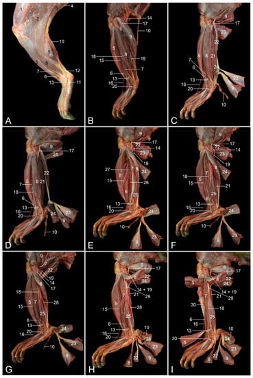 Lateral views of the left lower hindlimb. (A) Superficial layer with the superficial venous system filled with red latex; (B) second layer after the m. biceps femoris was retracted; (C) third layer after the m. gastrocnemius caput laterale, the m. gastrocnemius caput mediale and the v. saphena lateralis were transected and retracted; (D) fourth layer after the m. soleus was transected and the stumps were retracted; (E) fifth layer after the m. plantaris was transected and the stumps were retracted; (F) sixth layer after cranial retraction of the m. extensor digitorum longus and the m. fibularis brevis; (G) seventh layer after the m. fibularis longus and the m. fibularis brevis were separated; (H) eighth layer after the m. fibularis longus was transected and the stumps were retracted; (I) deepest layer after the m. tibialis cranialis was transected and the stumps were retracted. 1: Fascia lata; 2: m. biceps femoris; 3: m. semitendinosus; 4: m. semimembranosus; 5: m. tibialis cranialis; 6: m. extensor digiti primi (hallucis) longus; 7: m. extensor digitorum longus; 8: m. fibularis longus; 9: m. gastrocnemius caput laterale; 10: v. saphena lateralis; 11: v. marginalis lateralis pedis; 12: tendo calcaneus communis; 13: retinaculum proximale; 14: a. + v. poplitea; 15: a. tibialis cranialis; 16: a. dorsalis pedis superficialis; 17: n. fibularis communis; 18: n. fibularis superficialis; 19: n. tibialis; 20: retinaculum distale; 21: m. tibialis caudalis; 22: m. plantaris; 23: m. gastrocnemius caput mediale; 24: m. soleus; 25: m. fibularis brevis; 26: a. tibialis caudalis; 27: n. fibularis profundus; 28: m. fibularis digiti quinti; 29: fibula; 30: tibia.