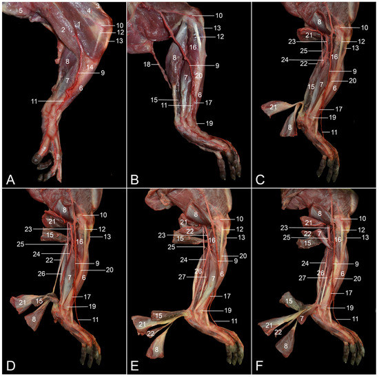 Medial views of the left lower hindlimb. (A) Superficial layer; (B) second layer after the m. sartorius and the m. gracilis were removed and the m. flexor digitorum medialis/tibialis was separated from the m. gastrocnemius caput mediale; (C) third layer after the m. gastrocnemius caput laterale, the m. gastrocnemius caput mediale and the v. saphena lateralis were transected and retracted; (D) fourth layer after the m. soleus was transected and its stumps were retracted; (E) fifth layer after the m. plantaris was transected and its stumps were retracted; (F) deepest layer after the m. flexor digitorum medialis/tibialis was transected and its stumps were retracted. 1: M. sartorius; 2: m. gracilis; 3: m. rectus femoris; 4: m. vastus medialis; 5: m. semimembranosus; 6: m. tibialis cranialis; 7: m. flexor digitorum medialis/tibialis; 8: m. gastrocnemius caput mediale; 9: a. saphena + v. saphena medialis + n. saphenus; 10: a. genus proximalis; 11: a. dorsalis pedis superficialis; 12: ligamentum collaterale mediale; 13: ligamentum patellae; 14: planum cutaneum tibiae; 15: m. soleus; 16: m. popliteus; 17: a. dorsalis pedis profunda; 18: v. saphena lateralis; 19: retinaculum proximale; 20: tibia; 21: m. gastrocnemius caput laterale; 22: m. plantaris; 23: a. + v. poplitea; 24: a. tibialis caudalis; 25: n. tibialis; 26: m. tibialis caudalis; 27: m. flexor digitorum lateralis/fibularis.