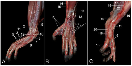 Lateral (A), dorsal (B) and medial (C) views of the left foot. 1: M. tibialis cranialis; 2: m. extensor digiti primi (hallucis) longus; 3: m. extensor digitorum longus; 4: m. fibularis longus; 5: mm. interossei pedis; 6: m. flexor digiti quinti brevis; 7: m. abductor digiti quinti; 8: m. quadratus plantae; 9: v. saphena lateralis; 10: v. marginalis lateralis pedis; 11: retinaculum proximale; 12: retinaculum distale; 13: m. adductor digiti primi (hallucis); 14: m. extensor digitorum et digiti primi (hallucis) brevis; 15: a. dorsalis pedis superficialis; 16: a. dorsalis pedis profunda; 17: m. gastrocnemius caput mediale; 18: m. abductor digiti primi (hallucis); 19: a. saphena + v. saphena medialis + n. saphenus; 20: v. marginalis medialis pedis; 21: planum cutaneum tibiae; 22: m. flexor digitorum medialis/tibialis.