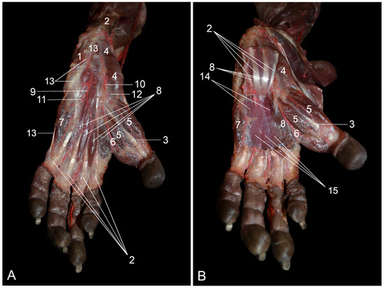 Plantar views of the left foot. (A) Superficial layer; (B) deeper layer after the tendons of the m. flexor digitorum medialis/tibialis and the mm. lumbricales pedis were proximally retracted. 1: m. quadratus plantae; 2: m. flexor digitorum medialis/tibialis; 3: m. flexor digitorum lateralis/fibularis; 4: m. abductor digiti primi (hallucis); 5: m. flexor digiti primi (hallucis) brevis; 6: m. adductor digiti primi (hallucis); 7: m. flexor digiti quinti brevis; 8: mm. lumbricales pedis; 9: a. plantaris lateralis; 10: a. plantaris medialis; 11: n. plantaris lateralis; 12: n. plantaris medialis; 13: m. abductor digiti quinti; 14: mm. interossei pedis; 15: mm. contrahentes digitorum pedis.