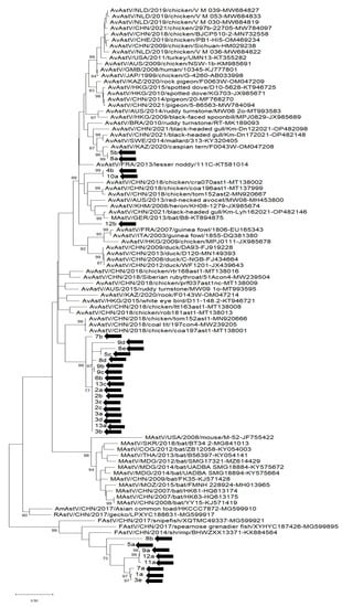 - Sun, N.; Yang, Y.; Wang, G.-S.; Shao, X.-Q.; Zhang, S.-Q.; Wang, F.-X.; Tan, B.; Tian, F.-L.; Cheng, S.-P.; Wen, Y.-J. Detection and Characterization of Avastrovirus Associated with Diarrhea Isolated from Minks in China. Food Environ. Virol. 2014, 6, 169–174. [Google Scholar] [CrossRef] [PubMed]