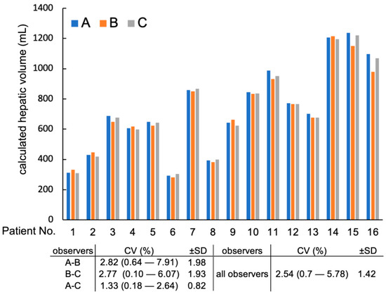 Interobserver variability of calculated full hepatic volumes by each observer. CV: Coefficient of Variation. Patients from 1 to 8 were with 2.5 mm slice intervals, whereas patients 9 to 16 were with 3.75 mm slice intervals.