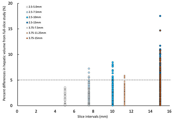 Percent differences in the hepatic volume of each slice interval compared to the corresponding full hepatic volumes (2.5-full or 3.75-full) were shown in Figure 3. The means (±SD) of the percent difference in hepatic volume compared to the corresponding full hepatic volumes (2.5-full or 3.75-full) were 1.4 (±1.1)% in 2.5–5.0 group, 2.6 (±1.7)% in 2.5–7.5 group, 3.0 (±2.1)% in 2.5–10 group, 5.0 (±3.1)% in 2.5–15 group, 1.3 (±1.2)% in 3.75–7.5 group, 2.4 (±1.5)% in 3.75–11.25 group, and 3.5 (±2.2)% in 3.75–15 group. The mean percent differences in hepatic volumes generally increased when using a larger slice interval (Figure 3). The greatest percent differences in hepatic volume compared to the corresponding full hepatic volume (2.5-full or 3.75-full group) were 3.6% at 5.0 mm slice interval (2.5–5.0 group), 3.8% at 7.5 mm slice interval (2.5–7.5 and 3.75–7.5 groups), 8.1% at 10 mm slice interval (2.5–10 group), 5.9% at 11.25 mm slice interval (3.75–11.25 group), and 6.7% at 15 mm slice interval (2.5–15 and 3.75–15 groups). The greatest percent difference in hepatic volumes was largest at 10 mm slice interval, larger than 11.25 and 15 mm slice intervals (Figure 3).