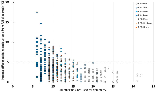 Percent differences in hepatic volume compared to 2.5-full or 3.75-full with numbers of slices used for hepatic volumetry. The percent difference lower than dotted line (less than 5%) is considered acceptable.
