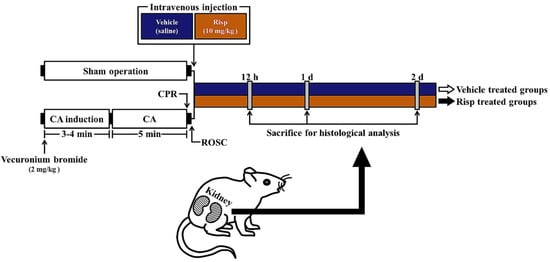 Experimental design and timeline. In this experiment, all rats underwent sham or CA/ROSC operation followed by administration of saline (vehicle) or Risp (10 mg/kg). The rats were profoundly anesthetized and sacrificed at 12 h, one day, and two days after CA/ROSC. Thereafter, the obtained kidneys were used for the analyses. CA, cardiac arrest; CPR, cardiopulmonary resuscitation; ROSC, return of spontaneous circulation; Risp, risperidone.