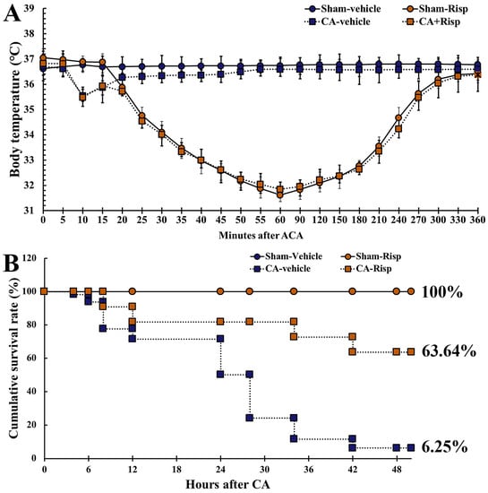 (A,B) Changes in body temperature (A) measured during and after CA/ROSC for six hours in four groups. Cumulative survival rate (B) assessed via using Kaplan–Meier analysis in four groups after CA/ROSC. The bars indicate the means ± SEM.