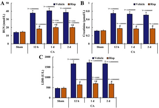 Changes in levels of BUN (A), creatinine (B), and LDH (C). The levels were determined at 12 h, one day, and two days after CA/ROSC. The levels of BUN, creatinine, and LDH in the CA-Risp group were significantly (p < 0.05) low when compared with the CA-vehicle group. The bars indicate the means ± SEM (n = 7, respectively; * p < 0.05 vs. Sham-vehicle group; # p < 0.05 vs. CA-vehicle group).