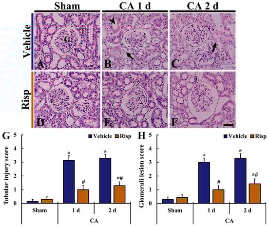 HE staining in the kidney of the Sham-vehicle (A), CA-vehicle (B,C), CA-Risp (D), and CA-Risp (E,F) groups one day and two days after CA/ROSC. In the rats of CA-vehicle group, the patchy denudation of renal tubular cells with loss of brush border (arrows), vacuoles in tubular cells (arrowheads), and tubular dilation are shown, which are more severe at 48 h after CA/ROSC. In the rats of the CA-Risp group, however, the CA/ROSC-induced alterations are apparently attenuated. G, glomerulus; T, tubule. Scale bar = 100 µm. (G,H) Tubular injury score (G) and glomeruli lesion score (H). The bars indicate the means ± SEM (n = 7, respectively; * p < 0.05 vs. Sham-vehicle group; # p < 0.05 vs. CA-vehicle group).