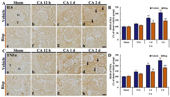 (A,C) Immunohistochemical staining of IL6 (A) and TNFα (C) in the kidney of the Sham-vehicle (a), CA-vehicle (b–d), Sham-Risp (e), and CA-Risp (f–h) groups at 12 h, one day, and two days after CA/CPR. IL6 and TNFα immunoreactivities in the CA-vehicle group are gradually and significantly enhanced after CA/CPR: On day 2 after CA/ROSC, strong IL6 and TNFα immunoreactivities are found in tubular cells (arrows). However, in the CA-Risp group, IL6 and TNFα immunoreactivities are significantly lower than those shown in the CA-vehicle group. G, glomerulus; T, tubule. Scale bar = 100 µm. (B,D) RODs of IL6 (B) and TNFα (D) immunoreactivities. The bars indicate the means ± SEM (n = 7, respectively; * p < 0.05 vs. Sham-vehicle group; # p < 0.05 vs. CA-vehicle group; † p < 0.05 vs. Pre-time point of corresponding group).
