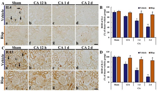 (A,C) Immunohistochemical staining of IL4 (A) and IL13 (C) in the kidney obtained from the Sham-vehicle (a), CA-vehicle (b–d), Sham-Risp (e) and CA-Risp (f–h) groups at 12 h, one day and two days after CA/ROSC. In the CA-vehicle group, IL4 and IL13 immunoreactivities (arrows) are gradually decreased after CA/CPR: two days after CA/ROSC, IL4 immunoreactivity is hardly shown and IL13 immunoreactivity is weak. However, IL4 and IL13 immunoreactivities of the CA-Risp group are maintained after CA/ROSC. G, glomerulus; T, tubule. Scale bar = 100 µm. (B and D) RODs of IL4 (B) and IL13 (D) immunoreactivities. The bars indicate the means ± SEM (n = 7, respectively; * p < 0.05 vs. Sham-vehicle group; # p < 0.05 vs. CA-vehicle group; † p < 0.05 vs. pre-time point of corresponding group).