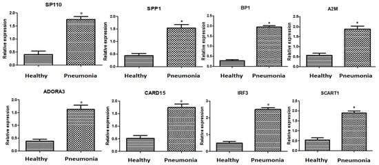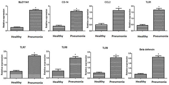 SLC11A1, CD-14, CCL2, TLR1, TLR7, TLR8, TLR9, β defensin, SP110, SPP1, BP1, A2M, ADORA3, CARD15, IRF3, and SCART1 gene expression comparisons in healthy and pneumonic Baladi goats. * indicates significance when p < 0.05.