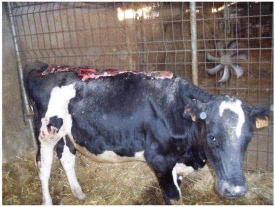 Clinical conditions were stable for two weeks (Figure 4); the heifer showed the ability to stand up and stay, regained tail movement, had increased appetite and had normal organic functions. Unfortunately, during the following five days of recovery, the heifer’s conditions worsened; it was not able to maintain the quadrupedal stance, its appetite decreased and recumbency became prolonged. Blood biochemical examinations showed progressive worsening of all parameters, but in particular, neutrophils (34,620/mm3), leukocytes (43,250/mm3), alkaline phosphatase (739 U/L, urea (26.70 mg/dL), glucose (106 mg/dL) and total cholesterol (33 mg/dL) concentration. Even potassium (3.7 mEq/L) and chlorine (89 mEq/L) showed severe abnormalities. Coagulation tests, such as the prothrombin time (52.7 s), activated partial thromboplastin time (61.1 s) and fibrinogen levels (4.83 g/dL), strongly suggested a condition of disseminated intravascular coagulation (DIC). Detailed results of the blood biochemical and coagulation profiles can be found in Tables S1 and S2. Therefore, due to the severe welfare impairment, the animal was humanely euthanized.