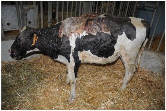 Heifer 1’s skin lesions three days after admission. Note the disjunction at the level of the fissure present on the neck and the thickening of the skin at the level of the ribs and abdomen.