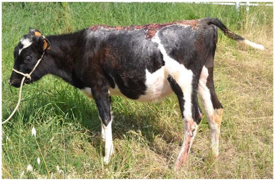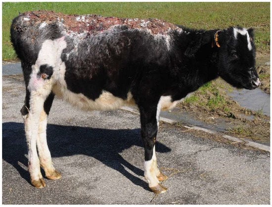 Heifer 1 presented depressed demeanor, reluctance to move and stiff gait. The head, the neck, all the dorsum and bilaterally the chest were hairless with dry and inelastic skin, covered by multiple and diffuse bubbles. At withers, there was a deep and complete split of the skin (Figure 1). The ears were short and curled, the eyelids had no eyelashes, and the protrusion of the third eyelid and paralysis of the eyelids were observed. Paralysis of the tail was also detected. The temperature was 37.5 °C, the pulse rate was 145 bpm and the breath rate was 40 breaths per minute.
