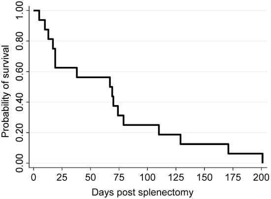 - Wendelburg, K.M.; Price, L.L.; Burgess, K.E.; Lyons, J.A.; Lew, F.H.; Berg, J. Survival time of dogs with splenic hemangiosarcoma treated by splenectomy with or without adjuvant chemotherapy: 208 cases (2001–2012). J. Am. Vet. Med. Assoc. 2015, 247, 393–403. [Google Scholar] [CrossRef] [PubMed]