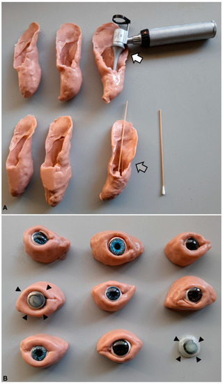 Ear (A) and eye (B) models made with moldable silicone. The ear models are at scale (medium sized dog) and allowed otoscopy (white arrow) and ear cytology (grey arrow) procedures. The eye models included the eye and eyelids; the corneas could be changed to represent various clinical conditions, such as corneal edema (arrowheads).